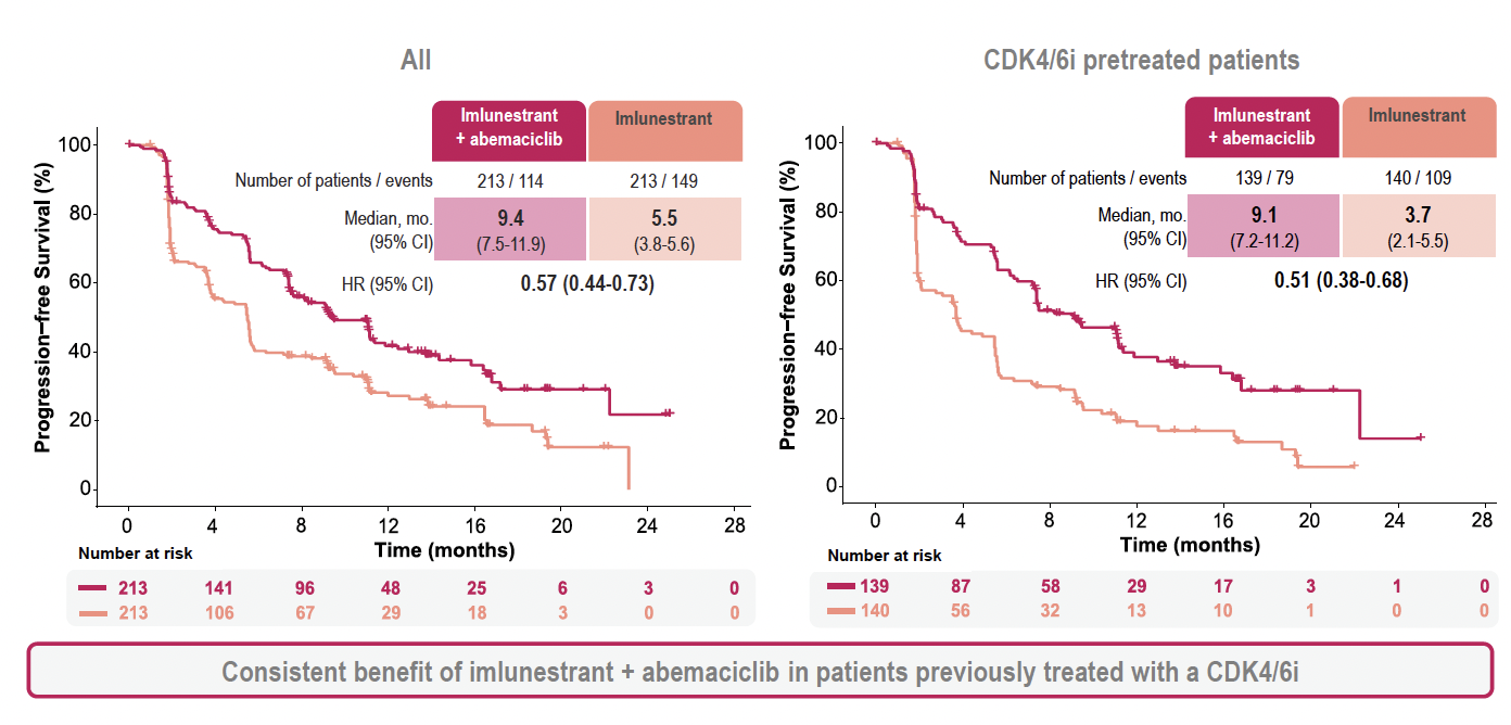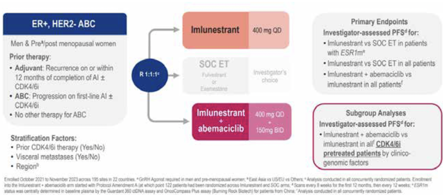 • Saura C, Carey L, Curigliano G et al. Imlunestrant (imlu) with or without abémaciclib (abema) in advanced breast cancer (ABC): a subgroup analysis in CDK4/6 inhibitor (CDK4/6i)-pretreated patients (pts) from EMBER-3. Ann Oncol 2025 ; 10 : 297O.
