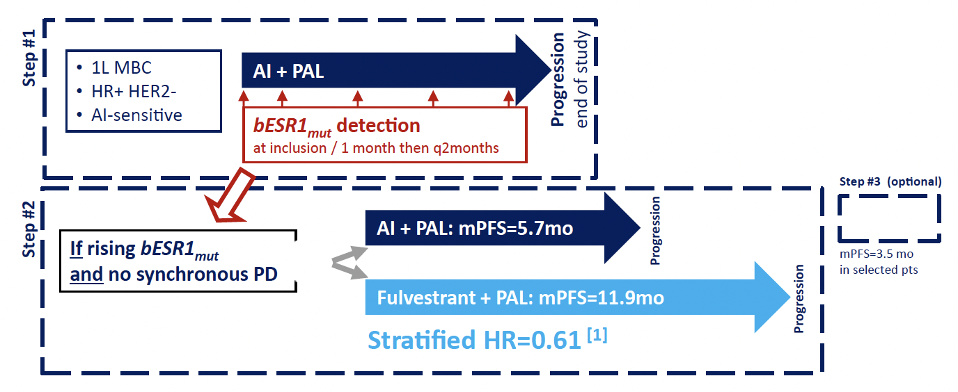 Cette étude académique de phase III randomisée a été pionnière dans la démonstration de l’intérêt clinique de la recherche de mutation ESR1 circulante (bESR1mut). Quand cette mutation est détectée précocement, c’est-à-dire avant la progression clinique, changer d’hormonothérapie en relayant une anti-aromatase par du fulvestrant tout en poursuivant le palbociclib retarde la progression clinique et la nécessité de passer à une 2e ligne de traitement métastatique (Fig. 3).