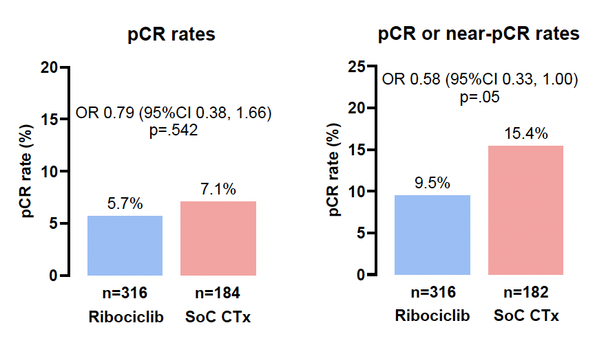 Nous ont été présentés les résultats des 554 patientes traitées en néoadjuvant et randomisées entre chimiothérapie ou HT + ribociclib.