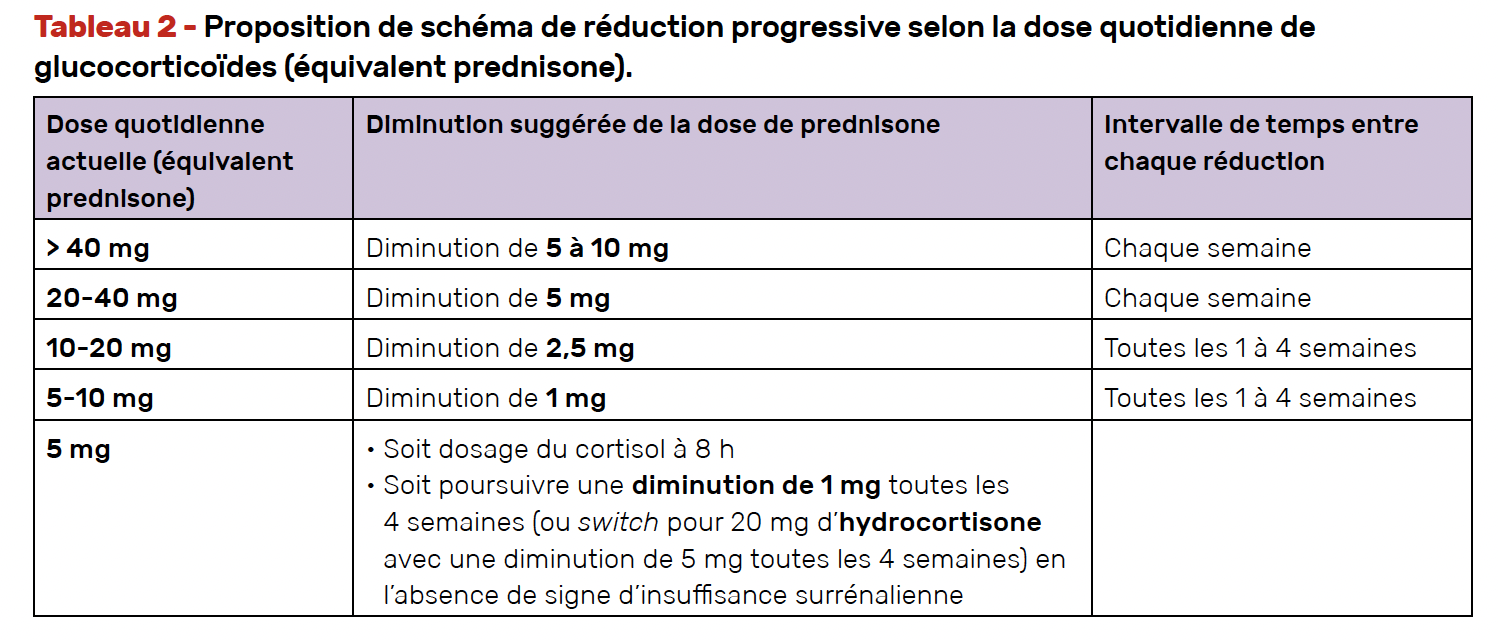 • Pour un traitement de plus de 3 semaines, il faut envisager un sevrage progressif (sur plusieurs semaines ou mois), dont la durée et les modalités dépendent de la dose et de la durée du traitement par GC (un exemple de schéma de décroissance dans le tableau 2).