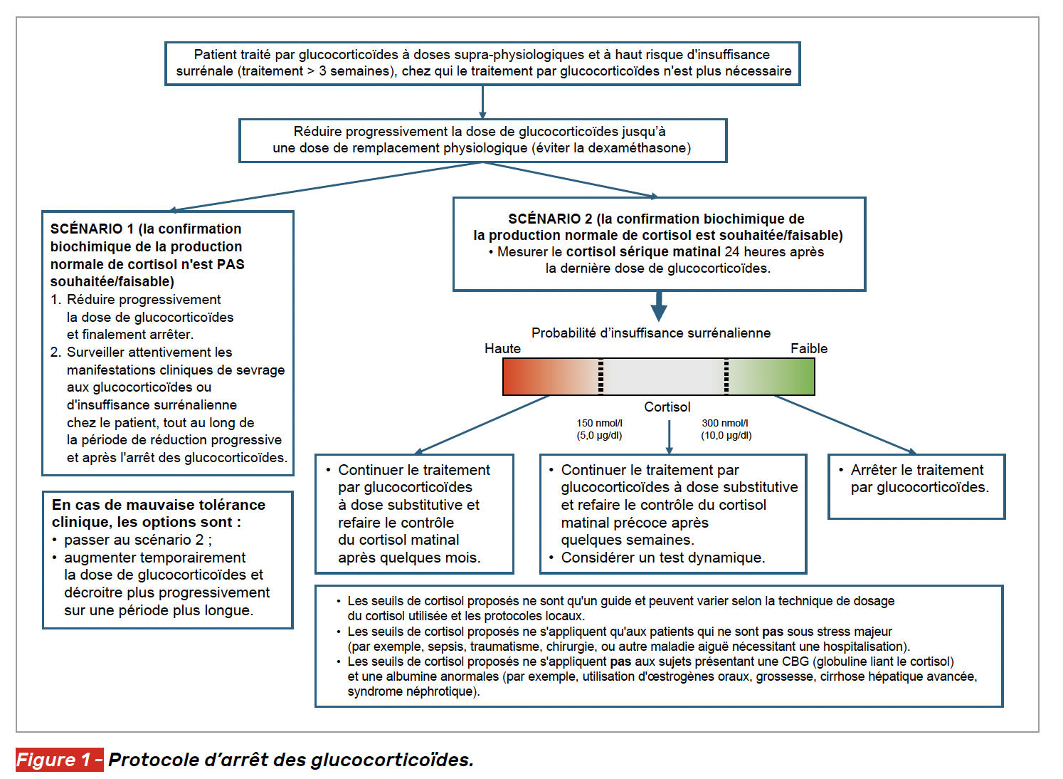 Ces seuils de cortisol ne sont qu’indicatifs et peuvent varier selon la méthode de dosage du cortisol utilisée et les protocoles locaux. Les seuils de cortisol proposés ne s’appliquent qu’aux patients qui ne sont pas en situation de stress (par exemple, sepsis, traumatisme, chirurgie ou autre maladie aiguë nécessitant une admission à l’hôpital). Enfin, ces seuils, reposant sur des dosages de cortisol total, dépendant de la CBG (Cortisol Binding Globulin), ne s’appliquent pas aux sujets présentant un taux de CBG ou d’albumine anormal (par exemple, insuffisance rénale, hépatopathie, syndrome néphrotique…). Il est alors préférable de mesurer le cortisol libre, par exemple salivaire (non remboursé actuellement en France).