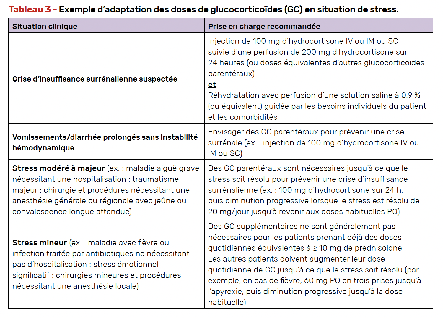 • Lorsque le traitement se rapproche des doses physiologiques ou en situation de stress peuvent apparaître des signes d’insuffisance surrénalienne (asthénie, nausée, douleur abdominale, vomissement, diarrhée, hyponatrémie, troubles hémodynamiques), qui nécessitent une augmentation du traitement par GC. Il convient d’éduquer le patient à reconnaître ces signes et à savoir augmenter son traitement. Il doit savoir anticiper cette situation et augmenter de lui-même en situation de stress (fièvre, infection, hospitalisation…) pour éviter une crise d’insuffisance surrénalienne aiguë. Cette augmentation de dose peut se faire PO, mais peut nécessiter une injection IV ou SC en cas de persistance de diarrhées ou vomissements malgré l’augmentation des doses PO ou en cas de signes hémodynamiques. Le patient doit être porteur d’une carte d’urgence standardisée.