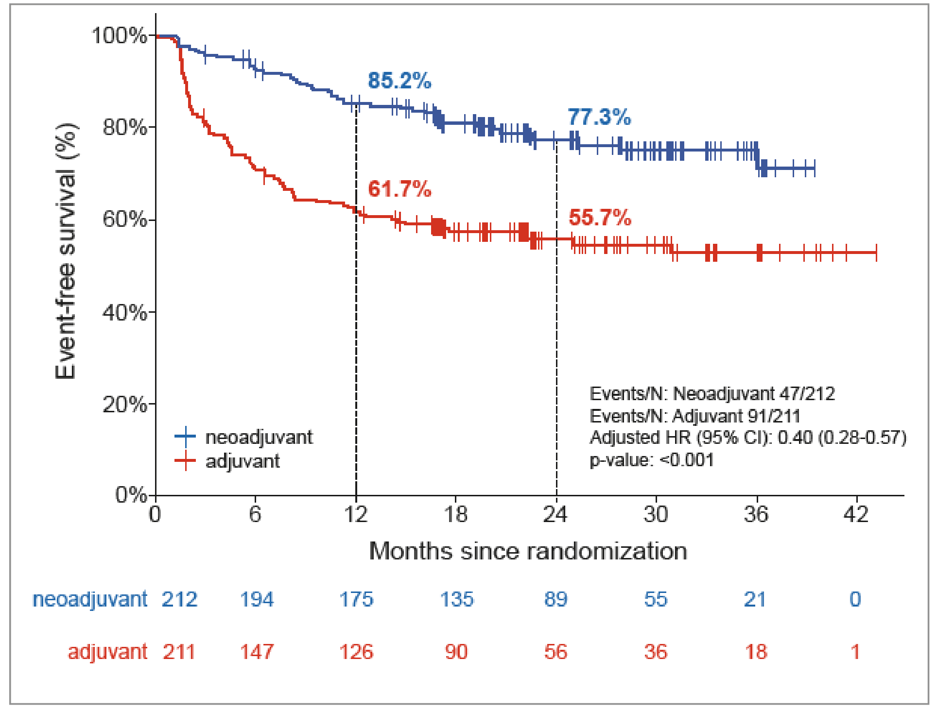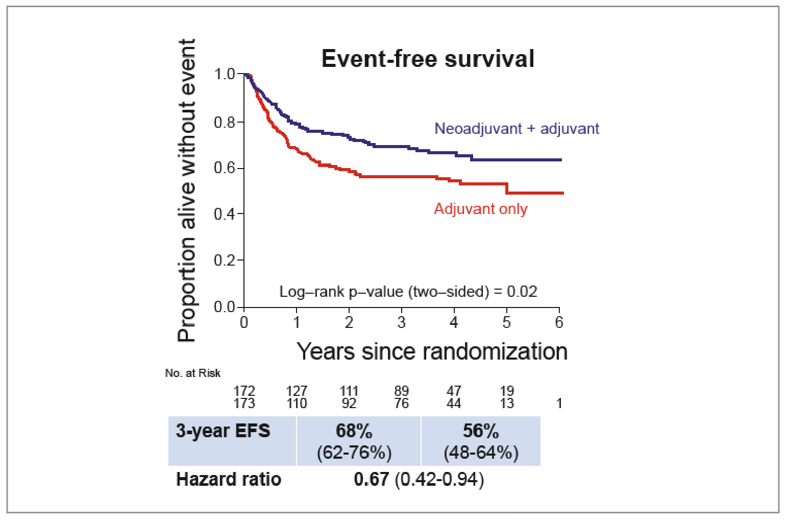 • Il existait aussi un gain en SSR supérieur dans le groupe néoadjuvant + adjuvant avec un HR de 0,42 (IC 95 % : 0,27-0,67 ; p = 0,0002), et une SSR à 3 ans de 80 contre 60 % pour l’adjuvant.