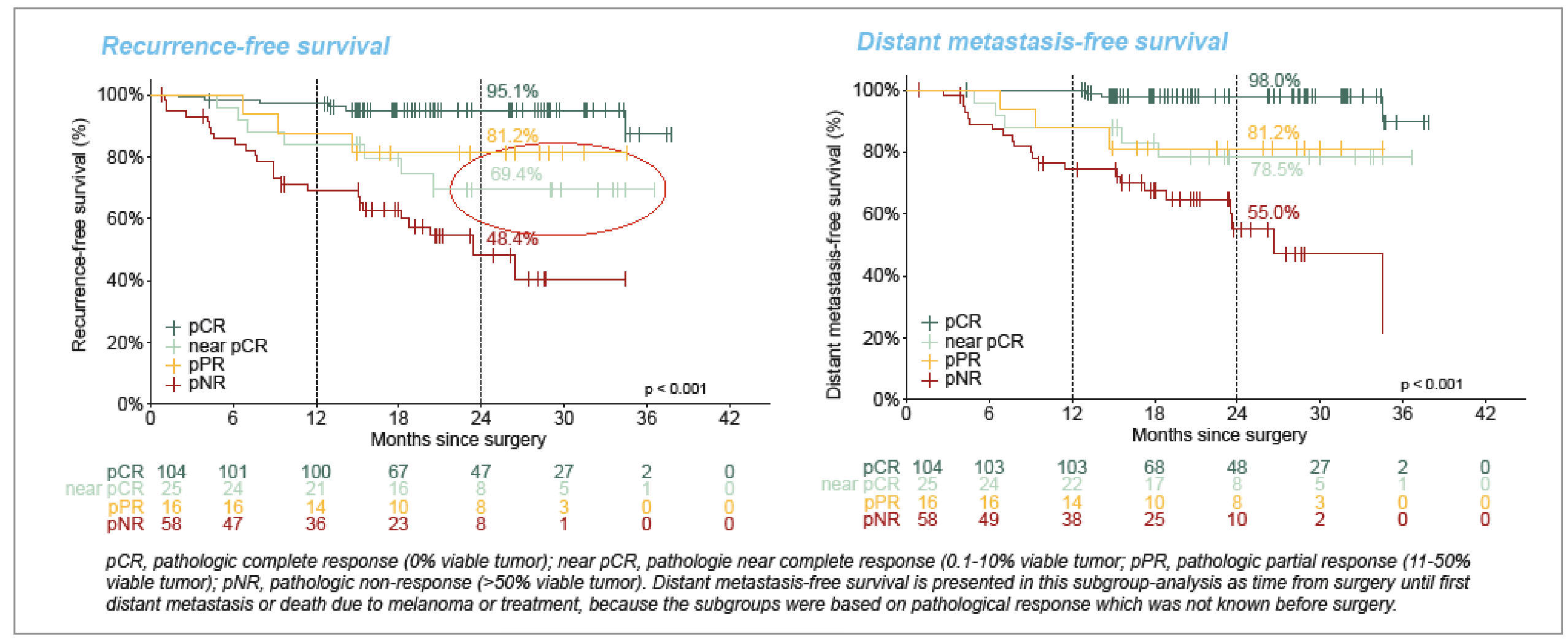 D’excellent résultats du traitement néoadjuvant par ipilimumab + nivolumab en cas de réponse histologique complète, en revanche, en cas de réponse quasi complète (moins de 10 % de cellules tumorales vivaces), les courbes sont un peu préoccupantes et posent la question de la poursuite d’un traitement adjuvant.
