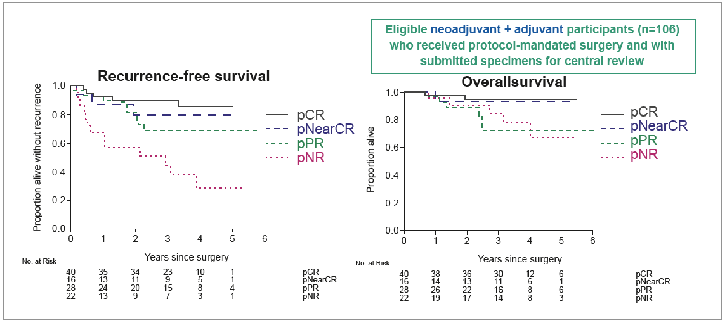 Figure 5 – SWOG S1801 : survie sans récidive et survie globale en fonction de la réponse pathologique.