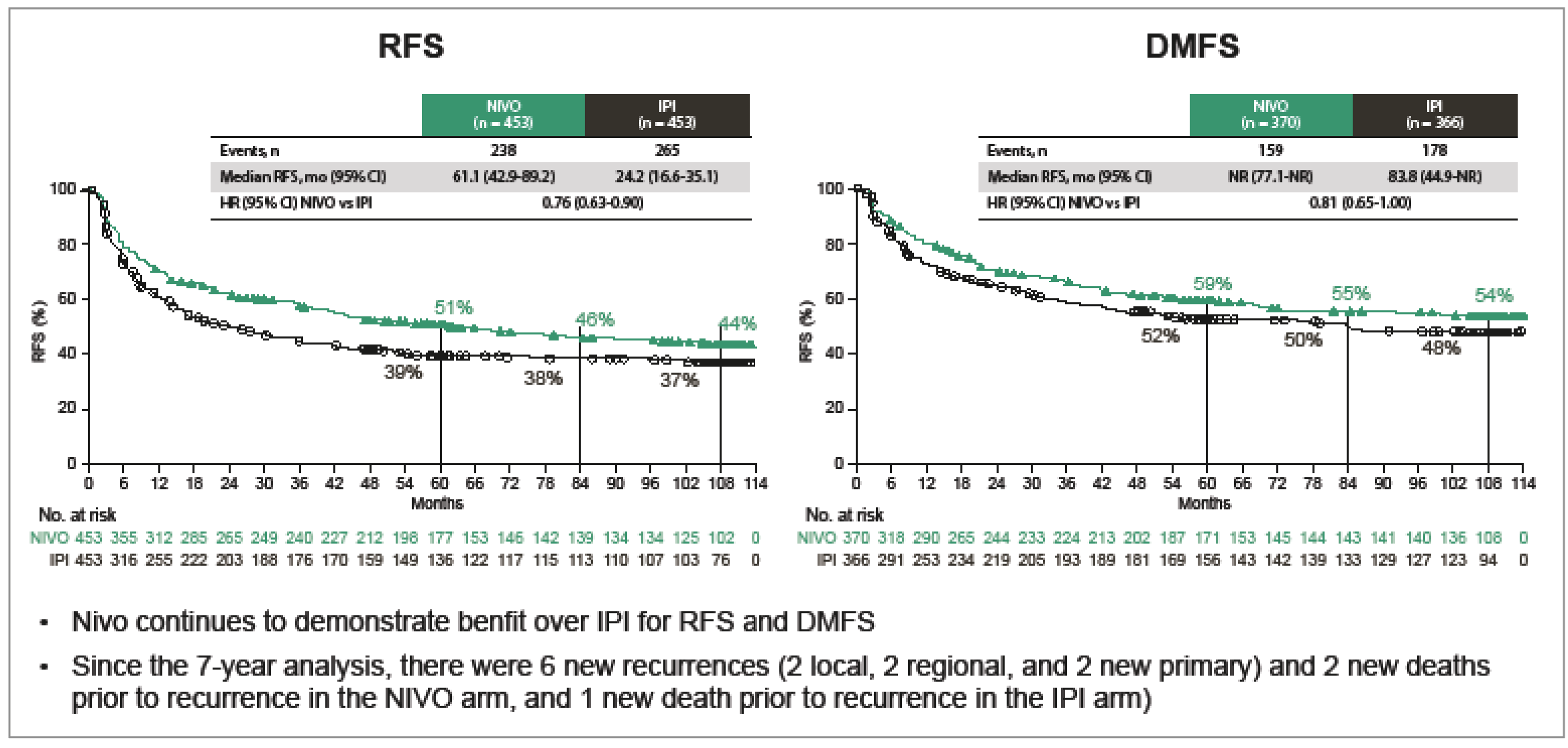 Pour rappel, il s’agit d’un essai pivotal qui a conduit à l’AMM du nivolumab en situation adjuvante sur des données de SSR/SSMD (FDA 2017, EMA 2018). Les résultats finaux à 9 ans ont été présentés ainsi que des analyses post hoc incluant la SSP jusqu’à la ligne suivante (SSP2), la survie spécifique au mélanome (SSM) et l’effet du calendrier d’administration des doses.