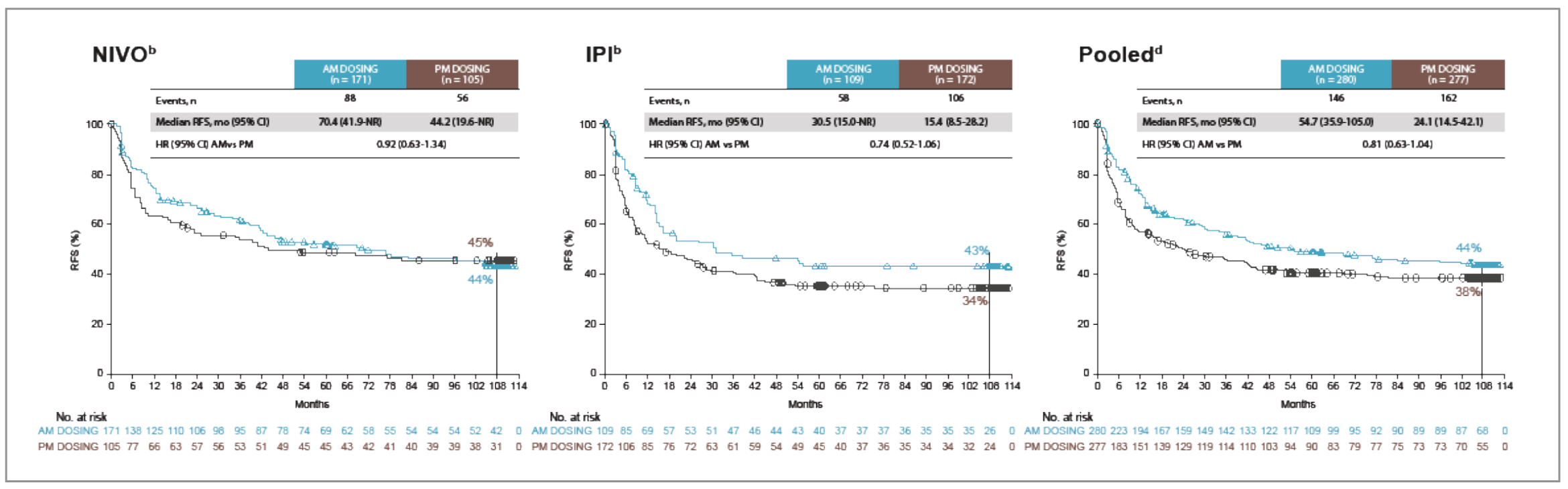 Figure 8 – CheckMate 238 : survie sans récidive ipilimumab et nivolumab en fonction de l’heure d’administration.