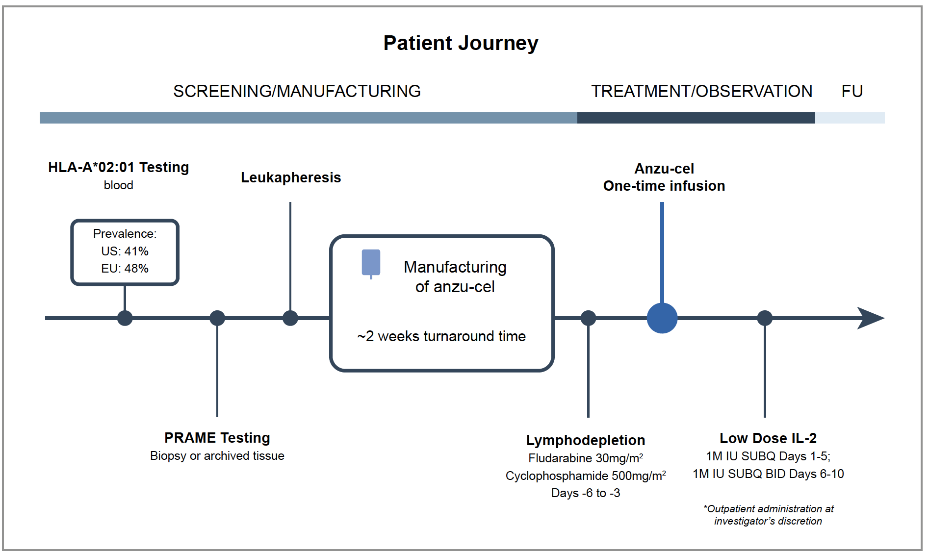PRAME (Preferentially Expressed Antigen in MElanoma) est exprimé dans 90 % des mélanomes uvéaux et constitue un biomarqueur pronostic. Anzu-cel (ou IMA203) est une immunothérapie cellulaire utilisant les lymphocytes T du patient dont le récepteur T a été modifié génétiquement pour reconnaître les peptides de PRAME présentés par les molécules HLA A*02:01 à la surface des cellules tumorales.
