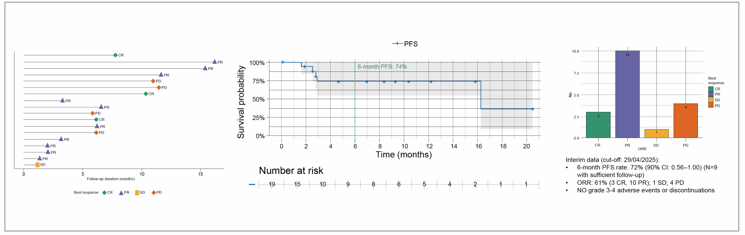 Le nombre de cycles administrés a été en moyenne de six, la SSP à 6 mois était à 72 %, mais avec six patients dont le suivi était de moins de 6 mois. Le taux de réponse était de 72 % (10 RP et 3 RC). Il n’y a eu aucun effet secondaire de grade III/IV (Fig. 11).