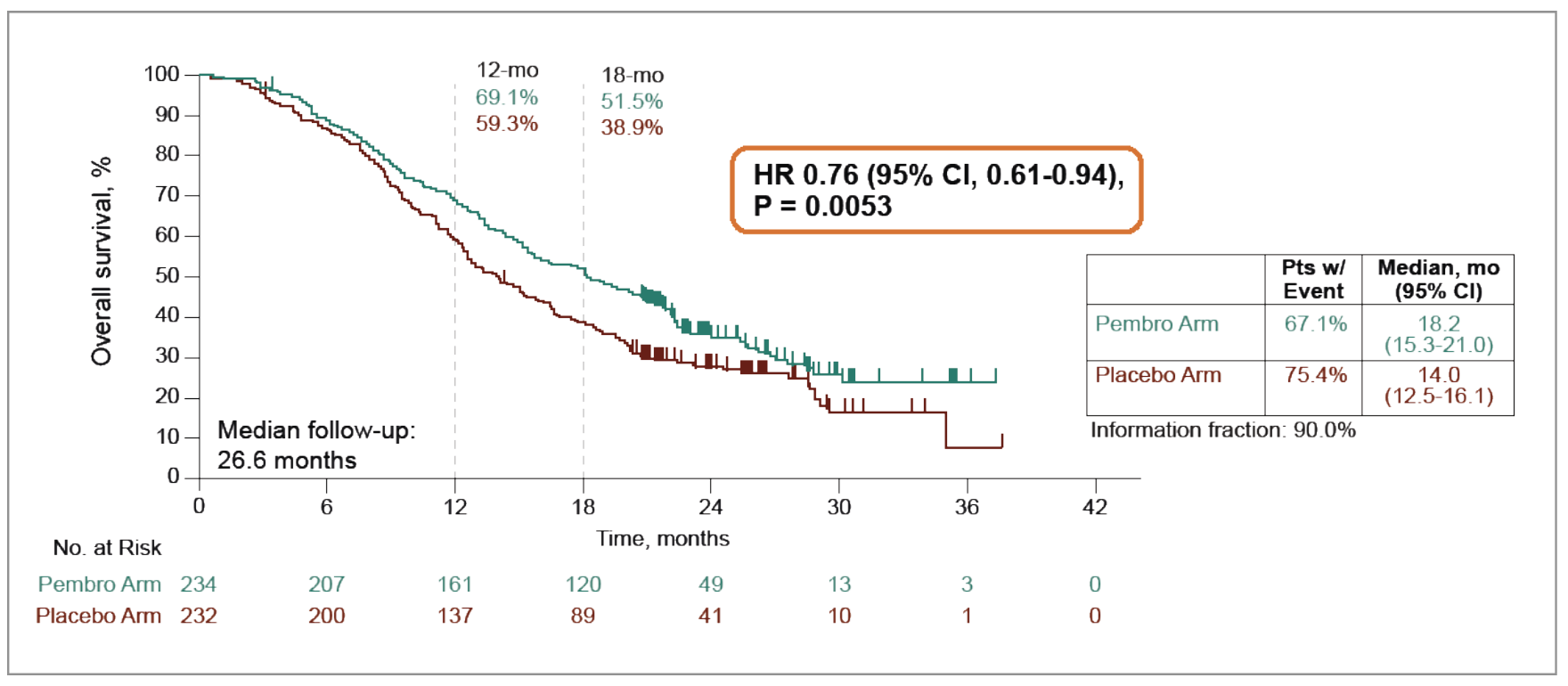 Le pembrolizumab a significativement prolongé la survie sans progression (SSP) dans la population ITT (8,3 versus 6,4 mois ; HR : 0,70 ; IC 95 % : 0,58-0,84 ; p < 0,0001). Une augmentation de la survie globale (SG) a été observée non seulement chez les patientes PD-L1 CPS ≥ 1 (18,2 versus 14 mois ; HR : 0,76 ; IC 95 % : 0,61-0,94 ; p = 0,0053) (Fig. 2), mais aussi dans la population ITT (17,7 versus 14 mois ; HR : 0,81 ; IC 95 % : 0,68-0,97 ; p = 0,0114).