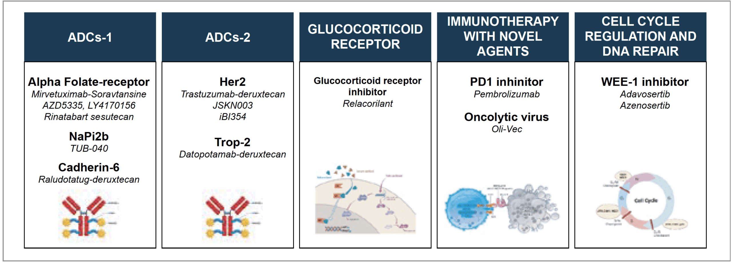 Le seul ADC commercialisé à ce jour cible le récepteur alpha des folates (mirvétuximab soravtansine). Il n’est efficace que chez les patientes ayant une forte expression du récepteur et est associé avec un payload inhibant les microtubules induisant troubles oculaires et neuropathie. Il est concurrencé par une série d’ADC ciblant le même récepteur, mais avec un payload d’inhibiteur de la topoisomérase 1 induisant de façon variable une hématotoxicité et des troubles digestifs, mais pas de neuropathie ou de troubles oculaires. En outre, ils sont le plus souvent efficaces même en cas d’expression faible du récepteur.