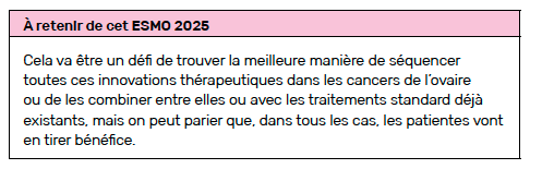 Cette observation doit être prise en compte pour analyser les résultats de l’étude chinoise présentée à l’ESMO où l’addition d’un autre inhibiteur de tyrosine kinase anti-VEGFR2 (apatinib) à un PARPi (fuzuloparib) ne montre pas de bénéfice en maintenance de première ligne de cancer de l’ovaire.